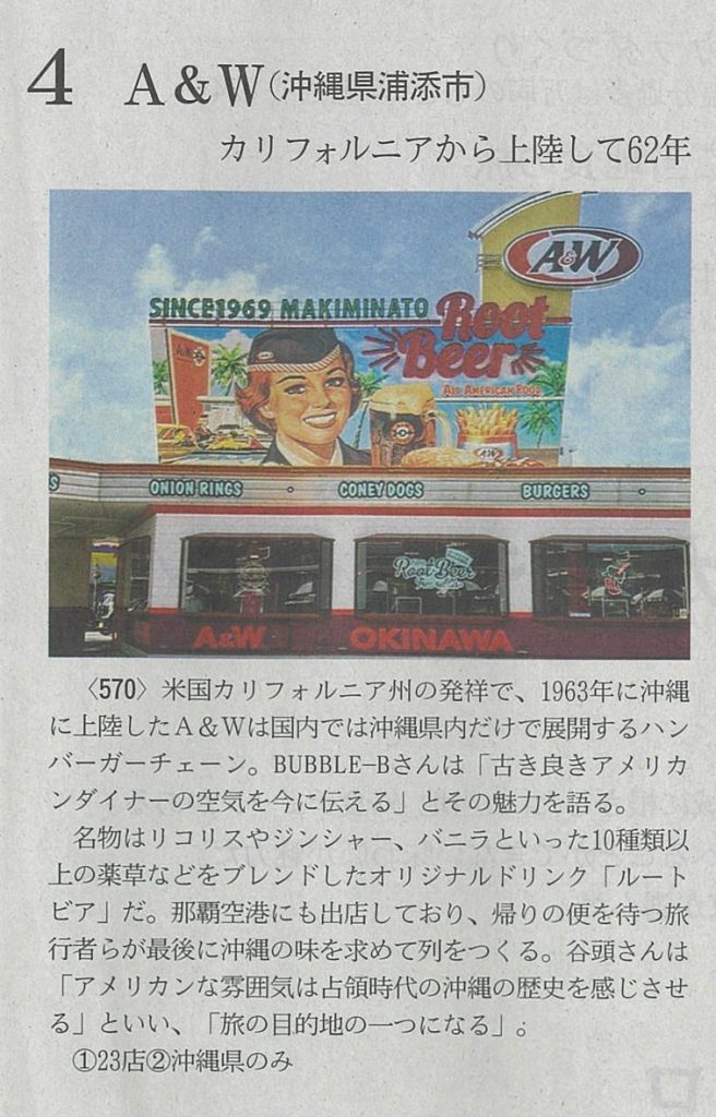 A&W日経新聞に掲載! 未分類 2025.12.13 日経新聞にご当地洋食ローカルチェーンという記事で A&W様が掲載されていますので、紹介いたします! A&Wは日本では沖縄県のみでの展開となり、観光にも人気の ハンバーガーチェーン店です。 沖縄に来た際はぜひお立ち寄りいただきたいお店の一つです!