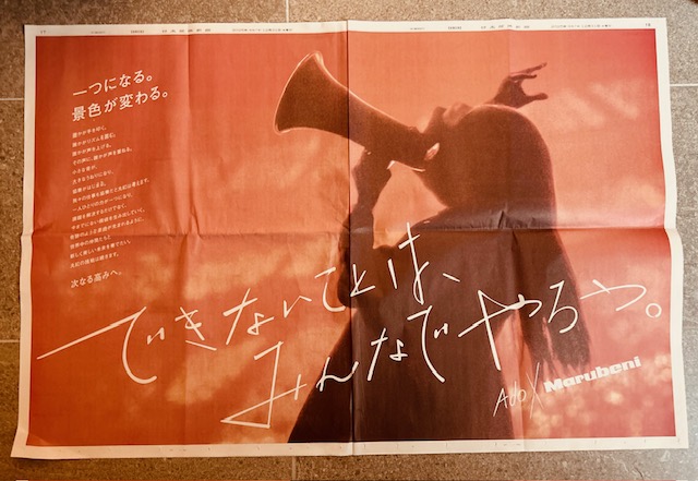 すべては、志からはじまる(新聞広告より) 日々のできごと 2026.01.08 おはようございま~す 南の島は清々しい朝を迎えております 新年から元気が出てくる広告に遭遇 こちらです↓ ”すべては、志からはじまる。” …それは、「人」。 前例のない挑戦が、市場を切り拓いた。新たな事業を生み出したのは、諦めなかった一人の想い… こちらもいいでね ”できないことは、みんなでやろう!” …小さな音が、大きなうねりになり、協奏がはじまる。 我々の仕事も協奏だと00は考えます。一人ひとりの力が一つになり。課題を解決するだけでなく、今までに価値を生み出していく!… 今日も明るく元気な挨拶を大切にしていきま~す 素敵な広告有難うございま~す
